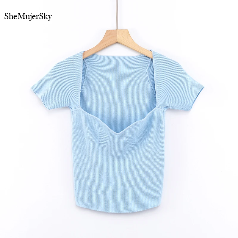 SheMujerSky сексуальный Вязаный топ с квадратным воротником, Женская однотонная блуза с коротким рукавом, летние эластичные рубашки 2020