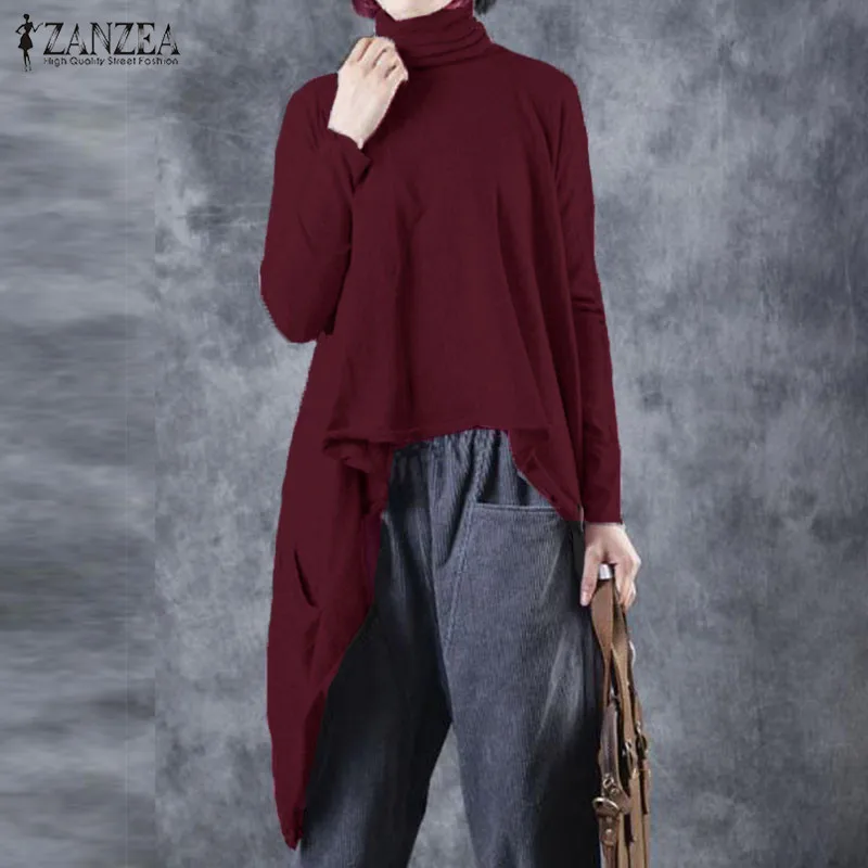 Модные женские рубашки с высоким воротом, ZANZEA 2020, необычная блузка, Стильная однотонная туника, топы для женщин, длинный рукав, топ большого размера 5XL