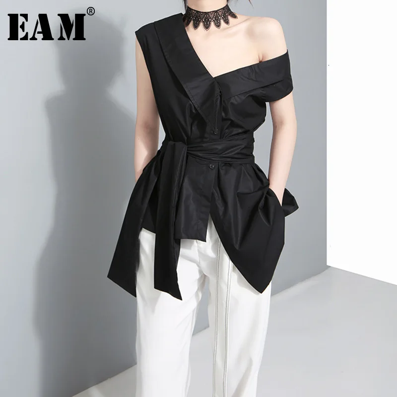 [EAM] Женская бандажная Асимметричная блуза с бантом, новая свободная рубашка с коротким рукавом и воротником, модная весенне-осенняя рубашка...
