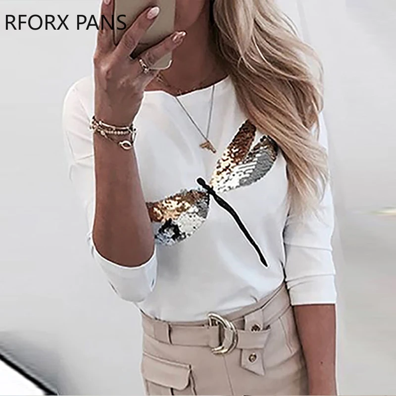 Женская футболка с круглым вырезом и длинными рукавами с рисунком стрекозы и блестками