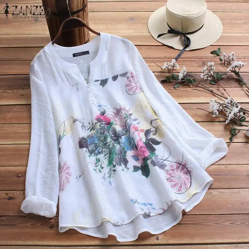 ZANZEA винтажная рубашка с принтом Женская Туника Осенняя блузка 2019 цветочные повседневные блузы женские рубашки с длинными рукавами плюс раз...