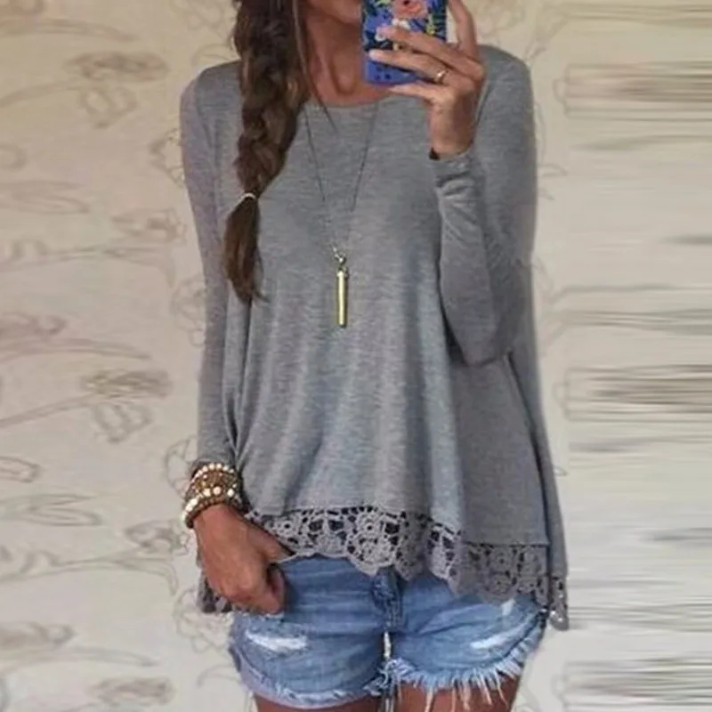 ZANZEA Spring Autumn Blouses Shirts Women Elegant Casual Loose Long Sleeve O Neck Lace Patchwork Tops Plus Size Solid Bluas 5XL