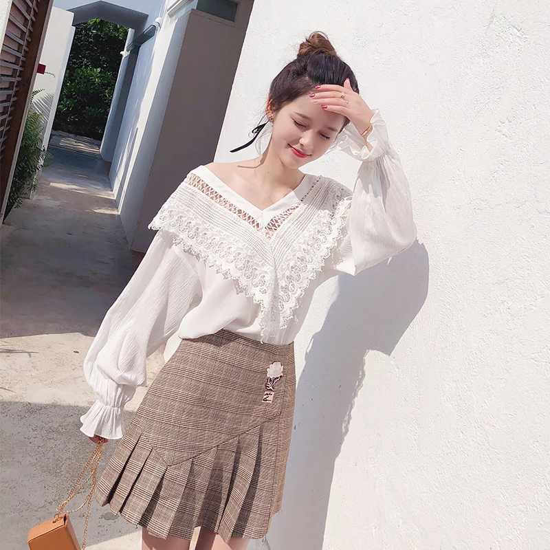 2019 Горячие блузки женские Крылья Ангела печатные с длинным рукавом Свободная рубашка с рисунком Повседневная Кружевная блуза с открытыми п...