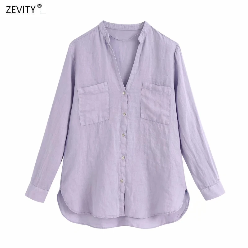Женская блузка с двойными карманами Zevity, повседневная льняная блузка фиолетового цвета, Женская Деловая блузка LS6798