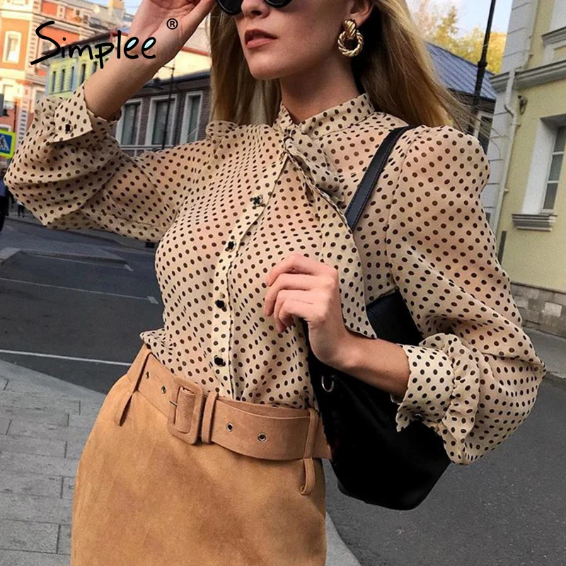 Simplee винтажная женская блузка в горошек с длинным рукавом, рубашка, Повседневная Весенняя блузка с завязками на шее, элегантная рабочая одежда, свободный женский офисный Топ