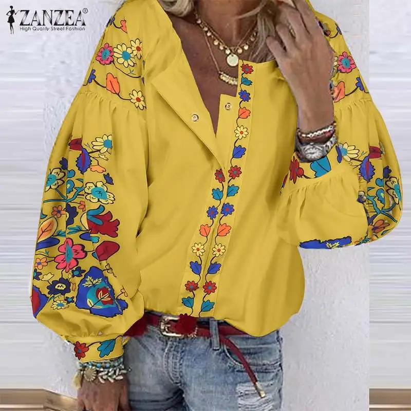Богемная блузка с цветочным принтом, ZANZEA, женские топы с длинным рукавом и пуговицами, повседневные весенние блузы, женские рубашки для работы размера плюс 7