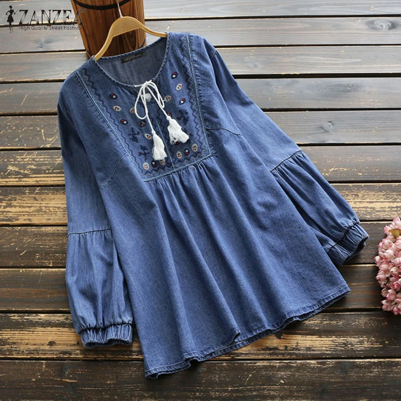 2019 ZANZEA Для женщин цветочные рубашки модный принт блузка с длинными рукавами, топ с рисунком из лоскутков Blusa Женский V образным вырезом Топ с ...