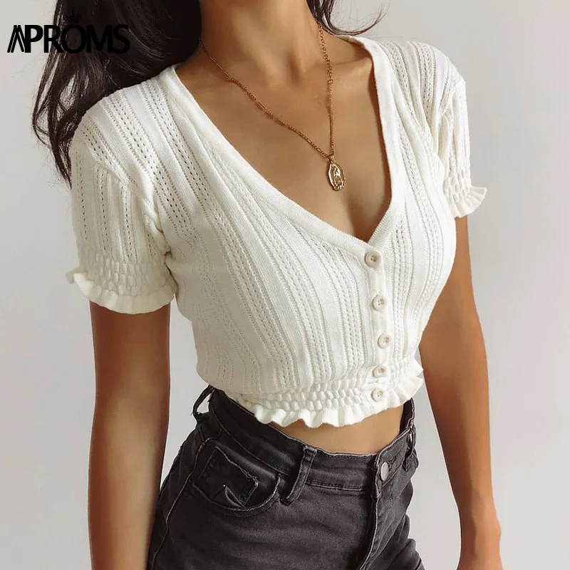 Aproms Элегантная трикотажная укороченная блузка в рубчик с v-образным вырезом, рубашка для женщин с оборками с коротким рукавом Кардиган с пуг...