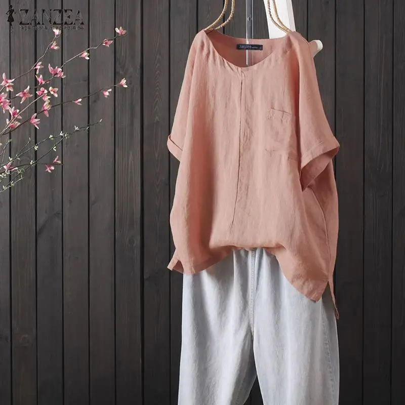 2019 ZANZEA рубашки с коротким рукавом Кафтан Женская Повседневная Блузка Туника женская с v-образным вырезом льняная Blusas нерегулярный летний топ плюс размер 5XL