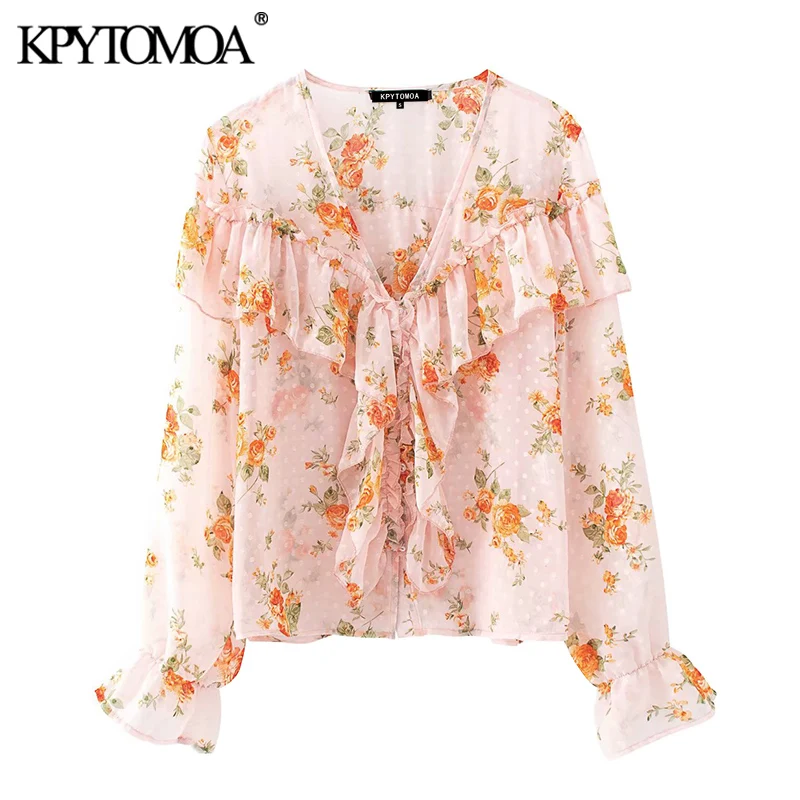 Женские шифоновые блузки с цветочным принтом KPYTOMOA, прозрачные блузки Vingta с v-образным вырезом и длинными рукавами, шикарные топы, 2020