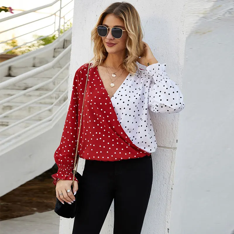2019 Весна Осень блузка в горошек Женская с длинным рукавом Свободная Женская блузка с v-образным вырезом женские блузки женская шифоновая бл...