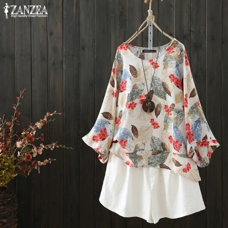 ZANZEA 2020 Женская Осенняя Цветочная блузка с круглым вырезом и рукавом 3/4, повседневная винтажная рубашка из хлопка и льна, мешковатые топы, Блузы туники, большие размеры