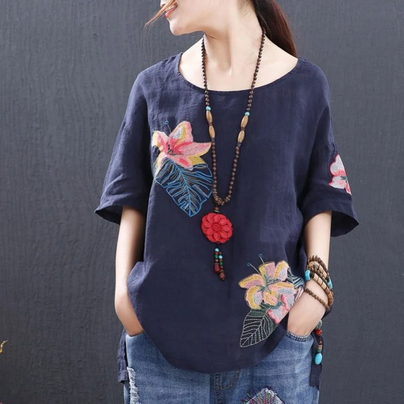 Блузки с коротким рукавом, большие размеры, хлопковые винтажные женские блузки с цветочной вышивкой, женские свободные повседневные топы б...