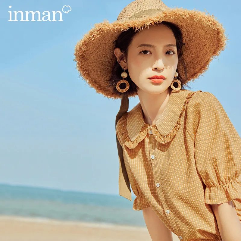 Новое поступление 2020 года; inman; Сезон лето; Винтажная Блузка в клетку с короткими рукавами в стиле Питера Пэна