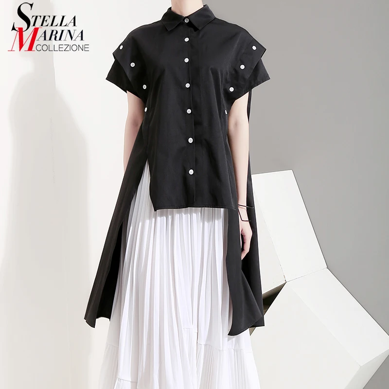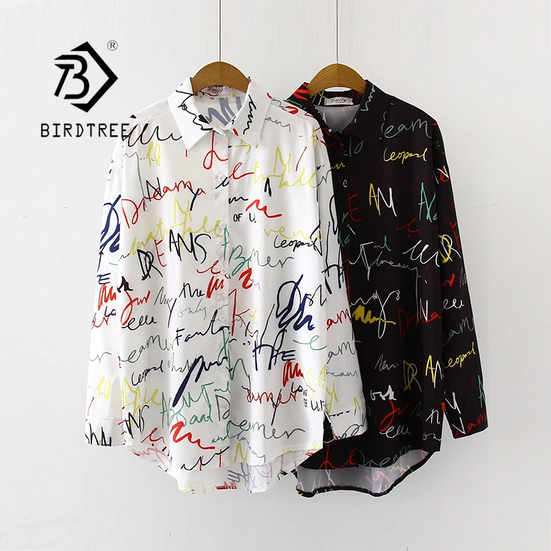 Новое поступление, длинная блуза с буквенным принтом и отложным воротником, Повседневная Свободная бело-черная рубашка на пуговицах, Feminina ...