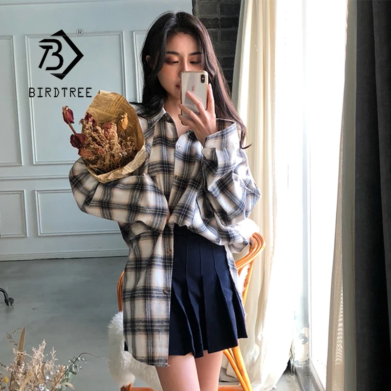 Новое поступление, Женская винтажная клетчатая рубашка, отложной воротник, на пуговицах, рукав летучая мышь, блуза с длинным рукавом, большо...