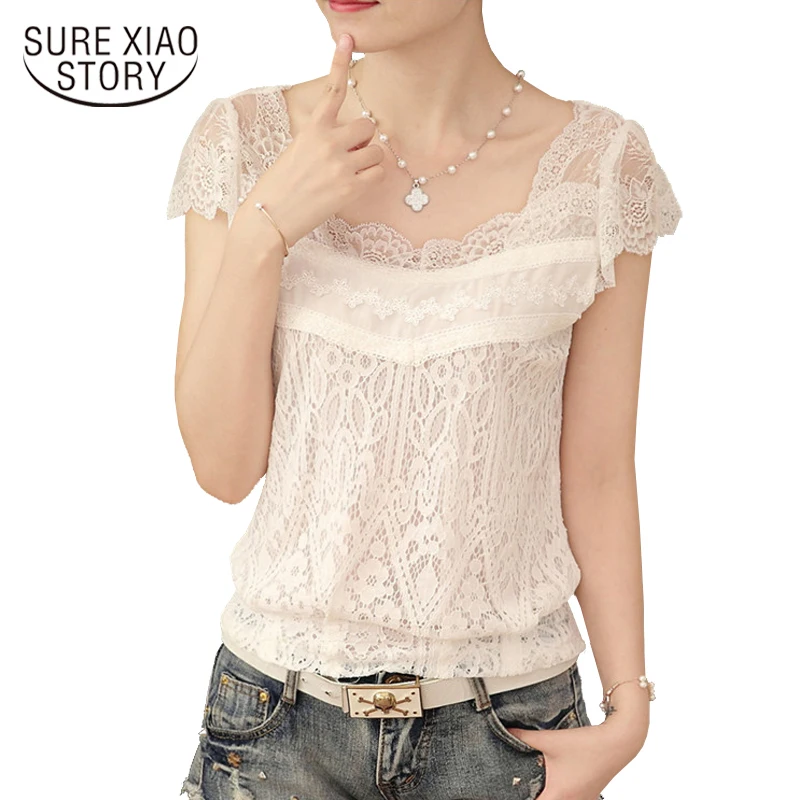 Лето 2019 Новый корейский стиль v-образным вырезом блузка Женская с коротким рукавом белая кружевная тонкая элегантная однотонная женская ру...