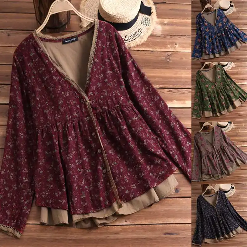 Осенняя женская блузка с цветочным принтом винтажная кружевная рубашка с v-образным вырезом на пуговицах из хлопка и льна женские топы Своб...