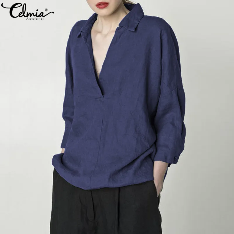 Celmia Summer Vintage Cotton Linen Blouse Women Tunic Tops Casual Loose Sexy V Neck Shirts Plus Size Black Blusas Femininas 2020
