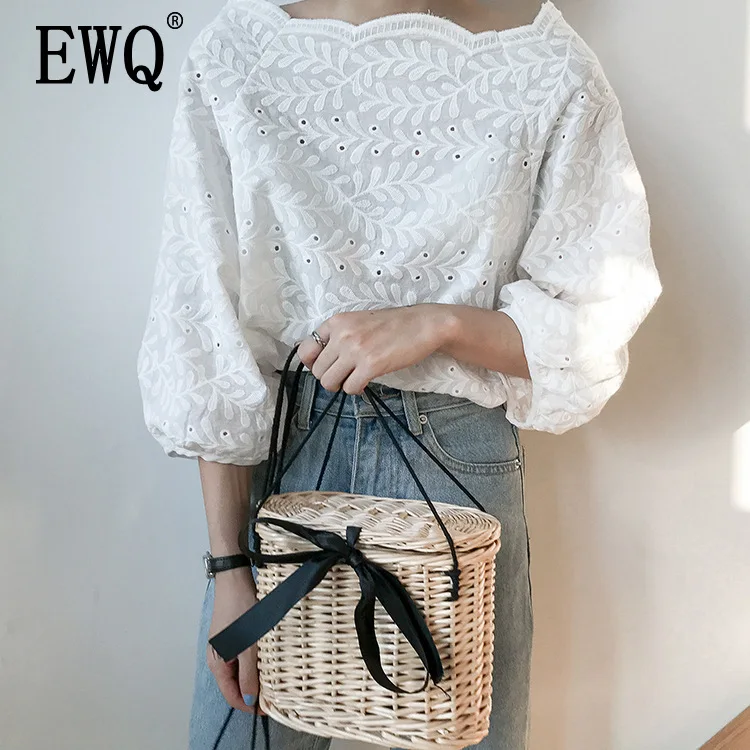 [EWQ] 2019 Весна Лето slash шеи три четверти рукав белый пэчворк выдалбливают пуловер-рубашка для женщин AH04400