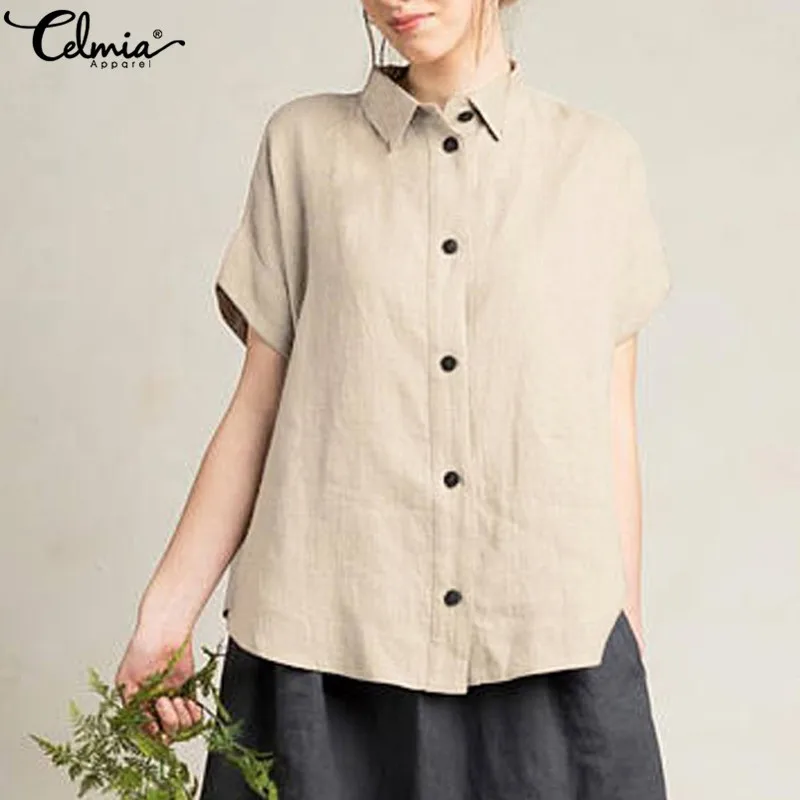 Женские Винтажные льняные топы, Однотонные блузки, летние рубашки cellia 2019, повседневные свободные блузы с отворотами и короткими рукавами, б...