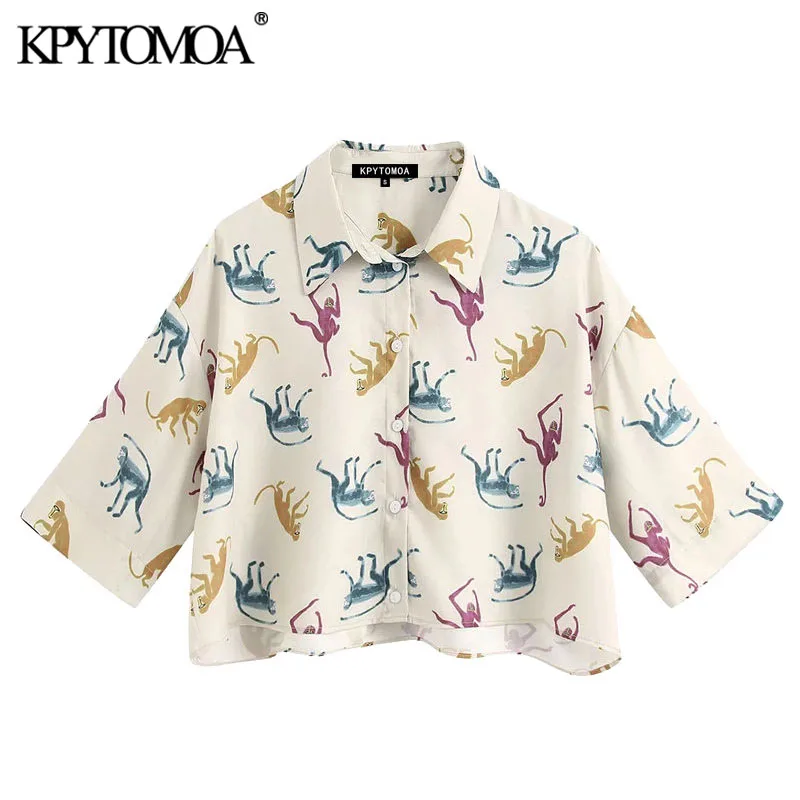 KPYTOMOA Женская мода 2020 Обрезанные блузки с животным принтом винтажные женские рубашки с отложным воротником и коротким рукавом Блузы шикарные топы