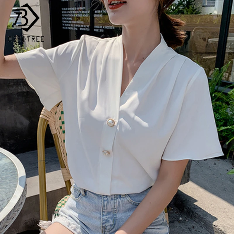 Женская летняя шифоновая блузка 2020, v-образный вырез, корейский стиль, короткий рукав-бабочка, женская рубашка, повседневные топы T03012K