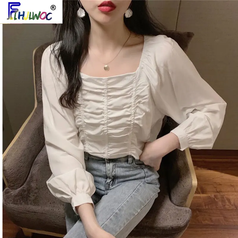 Весна 2020, новые дизайнерские топы, хит продаж, Женская Корейская японская модная драпированная белая короткая рубашка с открытыми плечами, блузки 3626