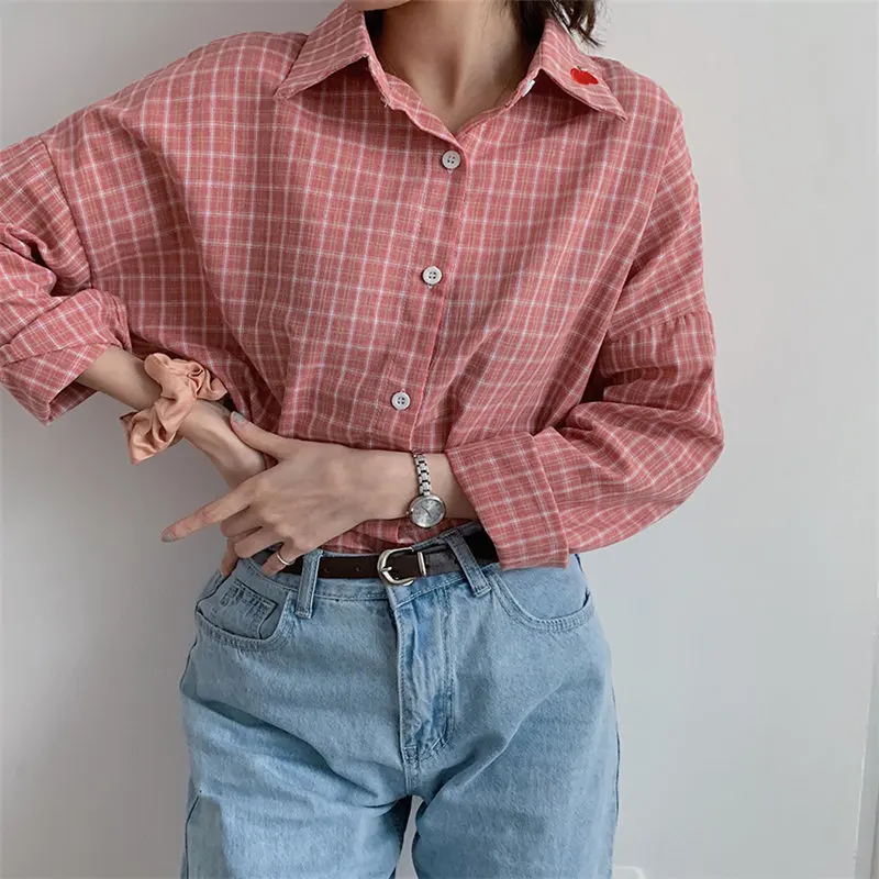 HziriP милые вышитые вишневые клетчатые элегантные универсальные геометрические высококачественные свободные блузки 2020 шикарные повседневные офисные женские рубашки