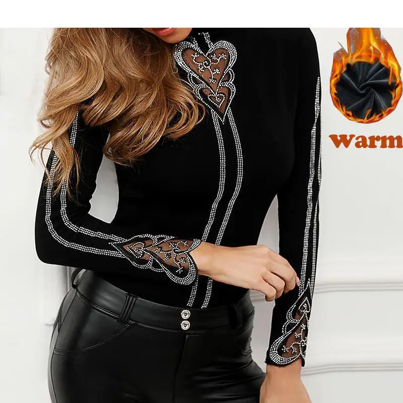 Женская блуза с длинным рукавом, плюс размер, выше размера, с шипами, с узором в виде сердца, однотонная, весна-осень, теплая, кашемировая, Тонкий Топ, шикарная элегантная рубашка