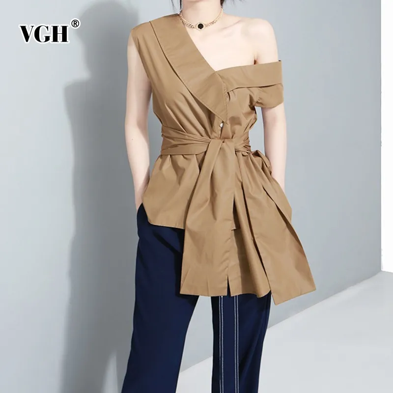 VGH на весну и зиму Для женщин BlouseTop женский с v-образным вырезом с открытыми плечами без рукавов Пояса Кнопка нерегулярные женский рубашка 2019 ...