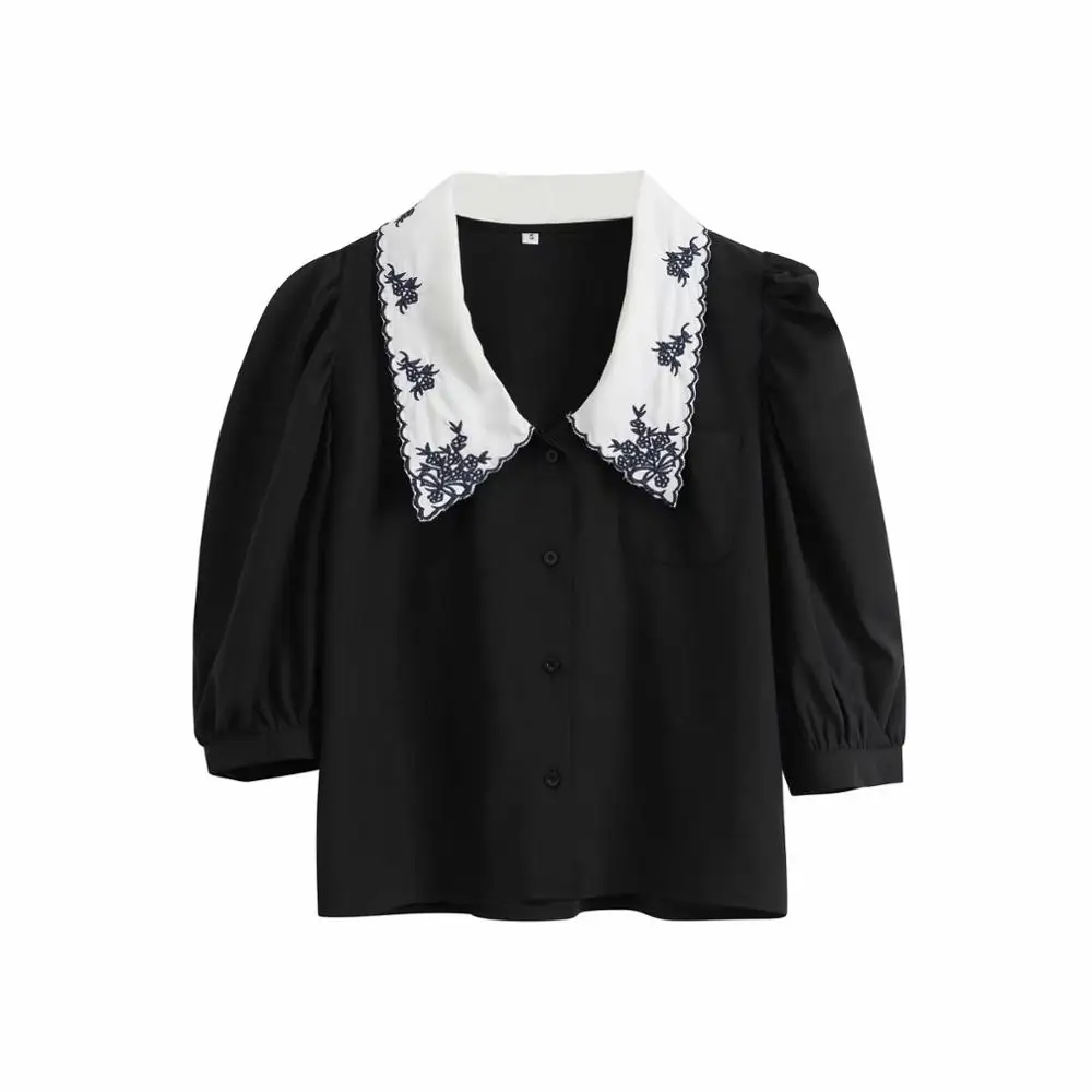 Новая весенняя модная женская Милая Повседневная Блузка с вышивкой и воротником Питер Пэн, офисные женские рубашки с пышными рукавами, шикарные Рубашки, Топы LS6467