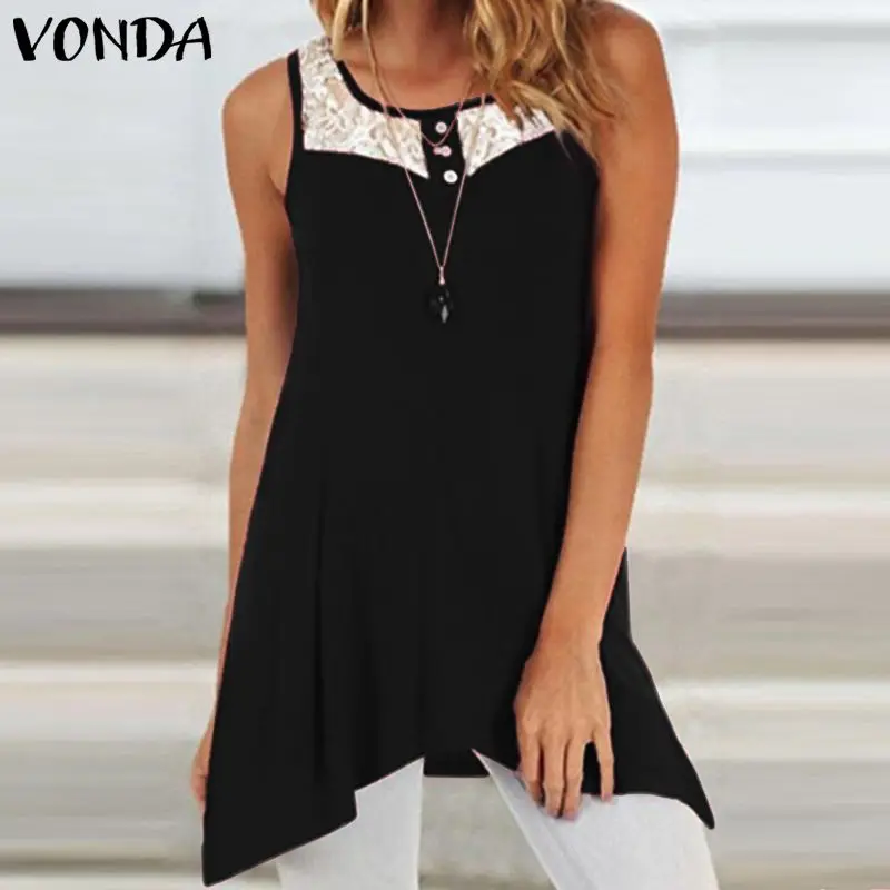 Женская блузка VONDA, сексуальная однотонная кружевная блузка без рукавов с круглым вырезом и асимметричным подолом, Повседневная Туника большого размера 2020
