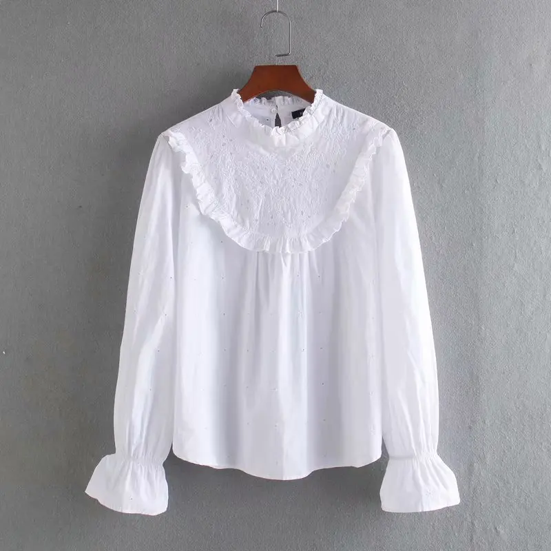 Женская кружевная блузка с вышивкой, Повседневная белая блузка с расклешенными рукавами и оборками, топы LS6393