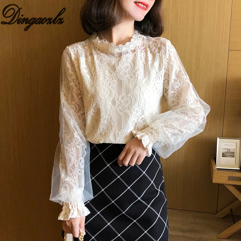 Dingaozlz корейские 2019 новые кружевные топы с сеткой, модная женская одежда с длинным рукавом, кружевная рубашка, элегантная кружевная блузка