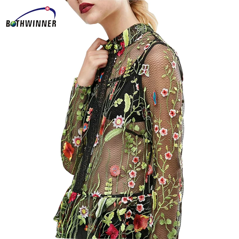 Bothwinner Блузки Топы ажурной отделкой сеточка, вышитая цветами летний топ с круглым вырезом и длинными рукавами, Винтаж блузка