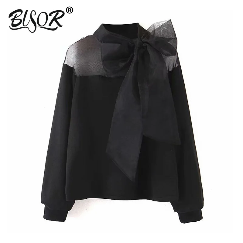 Женская милая Лоскутная Блузка с галстуком-бабочкой и воротником с длинным рукавом, женские повседневные черные топы, Черные блузы