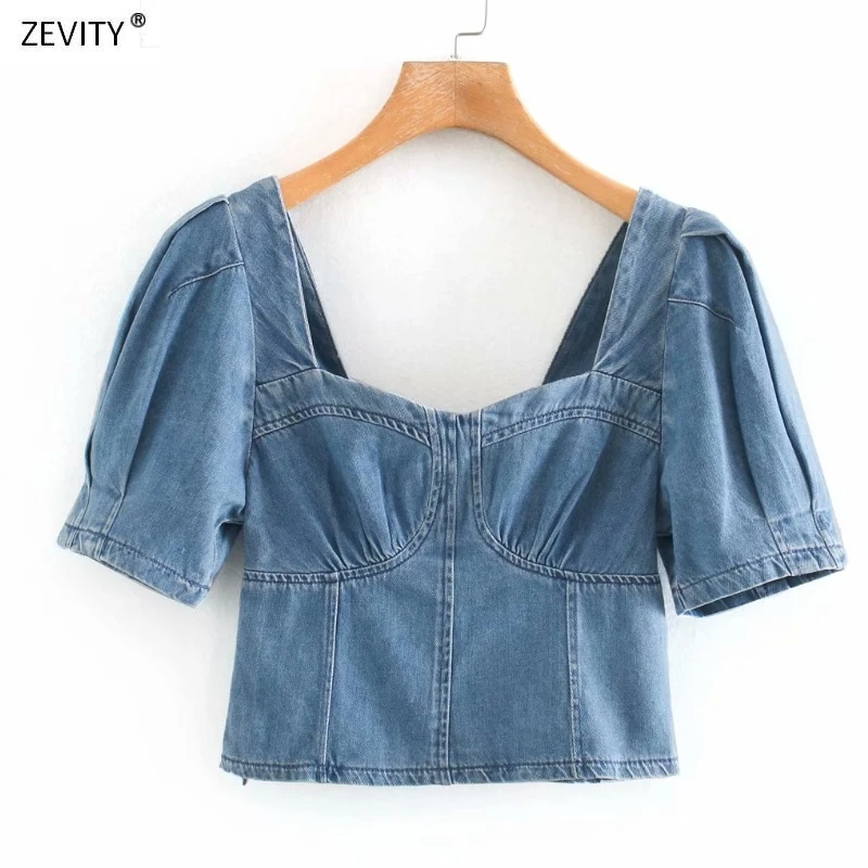 Женская винтажная Джинсовая блузка с квадратным воротником, Лоскутная Блузка с пышными рукавами, эластичная Облегающая рубашка на молнии сбоку, топы LS6767, 2020