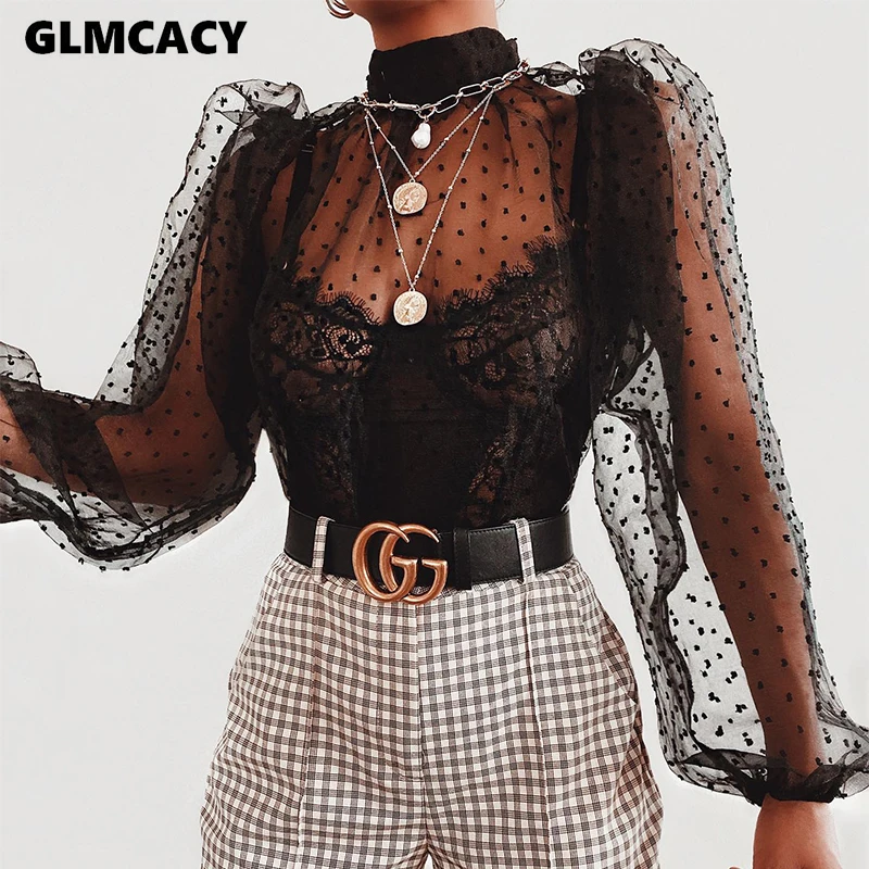 Женская летняя блузка с рукавами-фонариками, водолазка, сетчатый топ в горошек, сексуальный топ в горошек, прозрачный топ