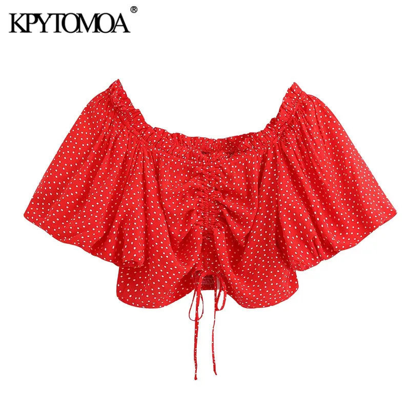 Женские блузки в горошек KPYTOMOA, винтажные укороченные блузки с пышными рукавами и регулируемыми завязками, элегантные топы, 2020
