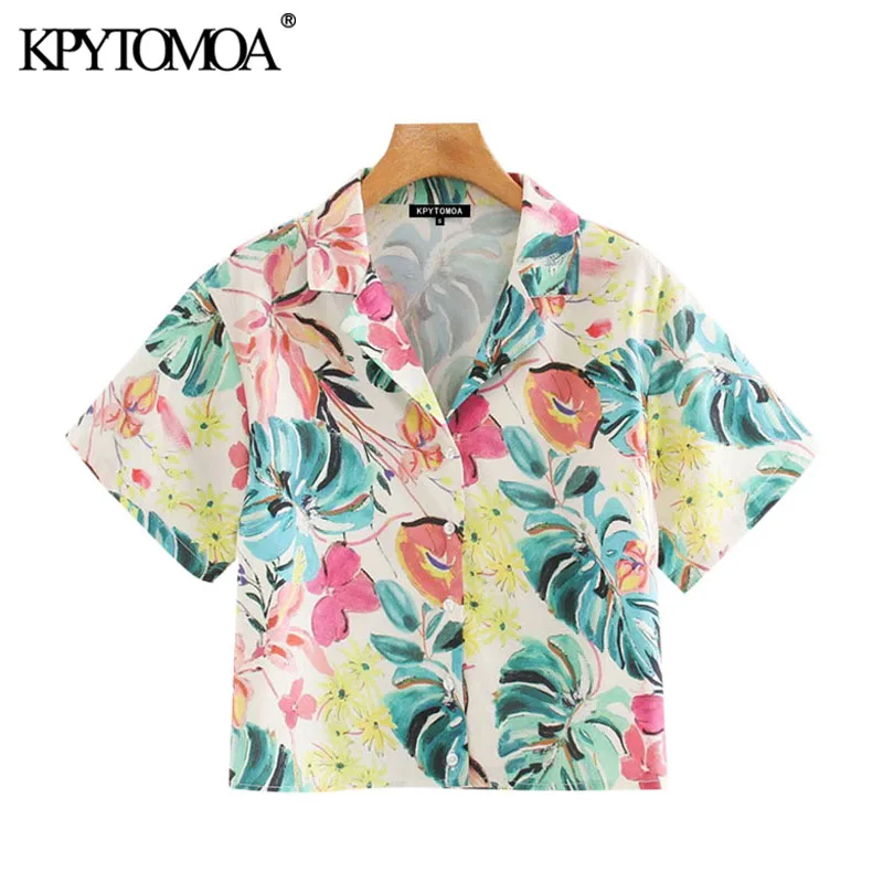 Женские блузки с цветочным принтом KPYTOMOA, винтажные свободные блузки с коротким рукавом на пуговицах, женские рубашки, шикарные топы, 2020