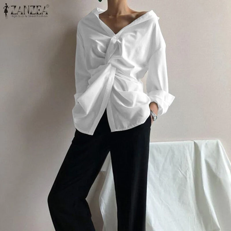 Элегантные летние топы, Женская Асимметричная блузка ZANZEA 2020, повседневные рубашки с длинным рукавом, женские блузы с отворотом, большие размеры, туника, топы