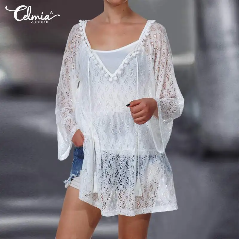 Женские Белые Кружевные блузы, летние сексуальные прозрачные сетчатые Блузы с v-образным вырезом, повседневные открытые топы, Пляжная накид...