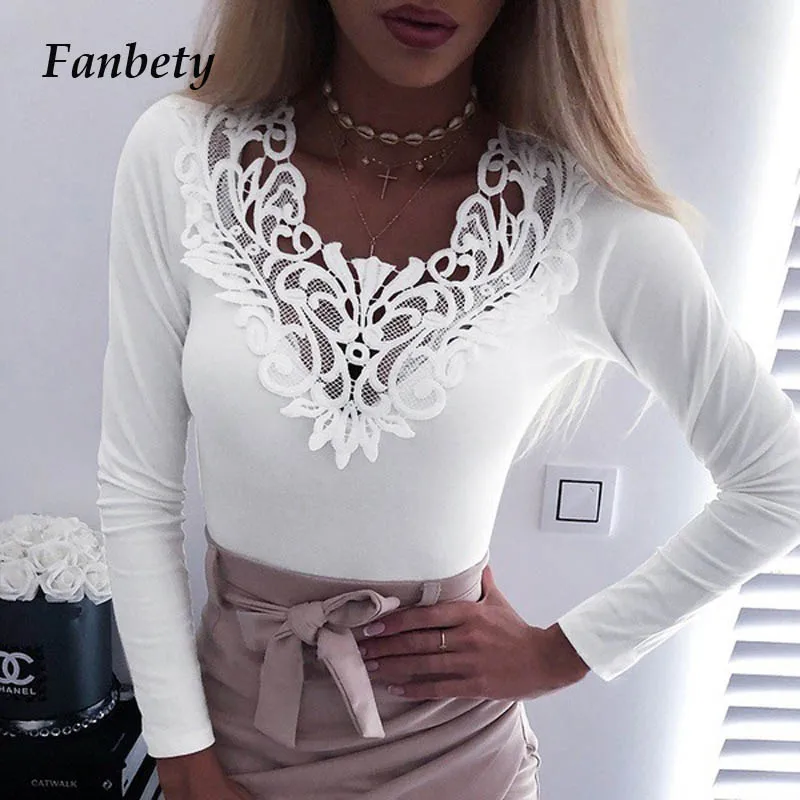2020 весенние кружевные открытые блузки, рубашка для женщин, осенняя однотонная блузка с длинным рукавом, элегантная Сексуальная блуза с v-обр...