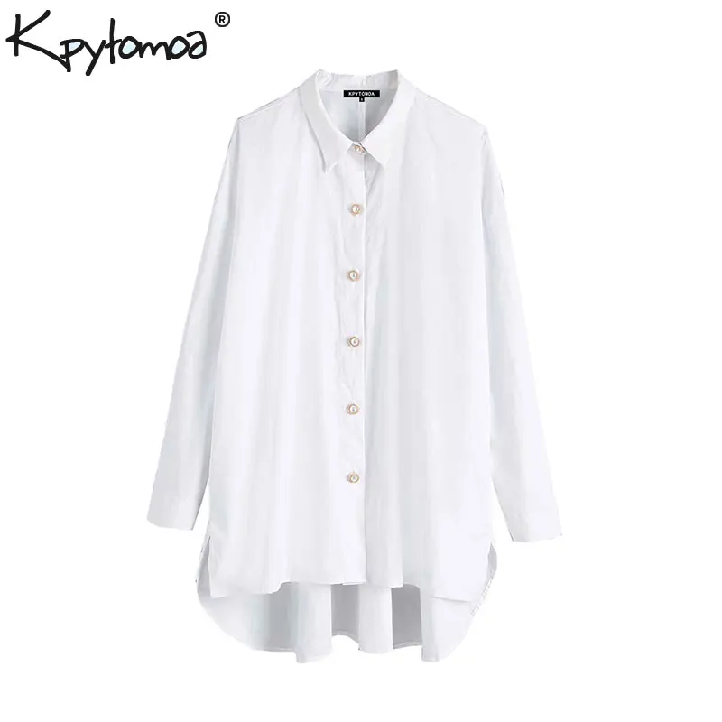 Винтажное элегантное украшение на пуговицах Асимметричные свободные блузки женские 2019 модные с отворотом воротник с длинным рукавом белые...