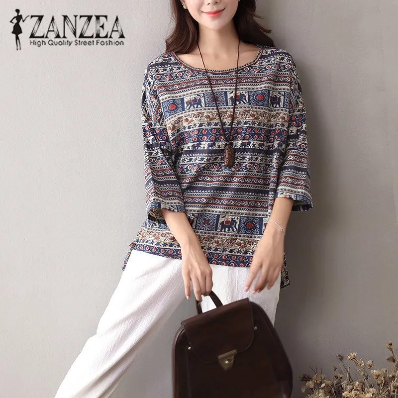 ZANZEA 2020 Женская Осенняя Цветочная блузка с круглым вырезом и рукавом 3/4, повседневная винтажная рубашка из хлопка и льна, мешковатые топы, Блузы туники, большие размеры
