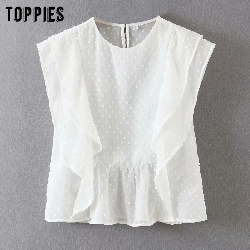 Летние белые кружевные топы, однотонные женские топы без рукавов, рубашки в горошек с оборками, милая одежда