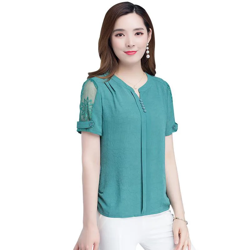 Женские весенне-летние стильные шифоновые Женские Блузки Рубашки повседневные Короткий кружевной рукав с круглым вырезом Blusas топы DF2967