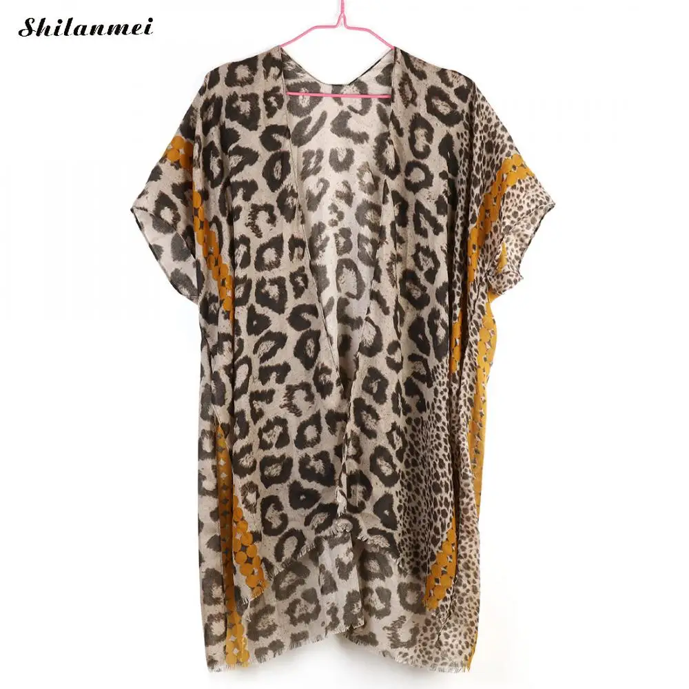 Винтажное женское летнее кимоно с леопардовым принтом Длинная блузка богемное цветочное пляжное богемное кимоно Женская рубашка кардиган ...