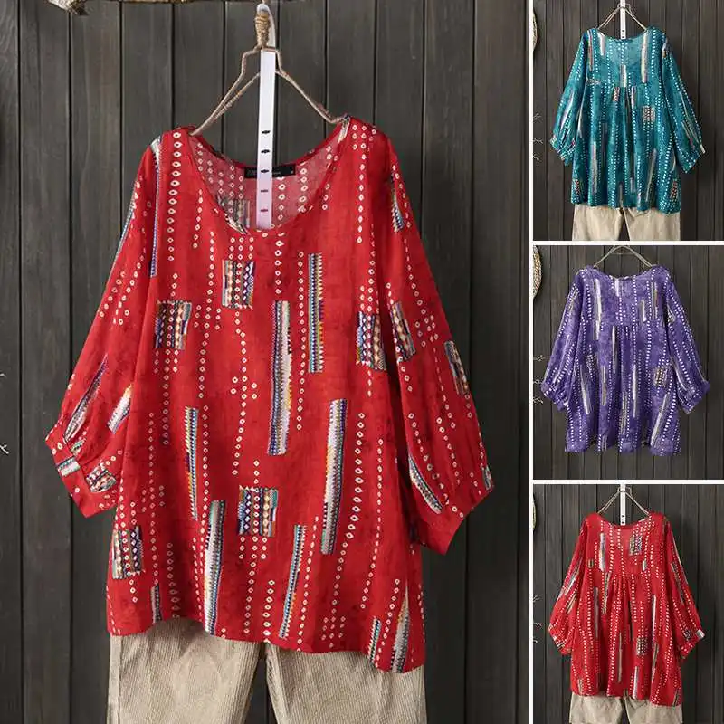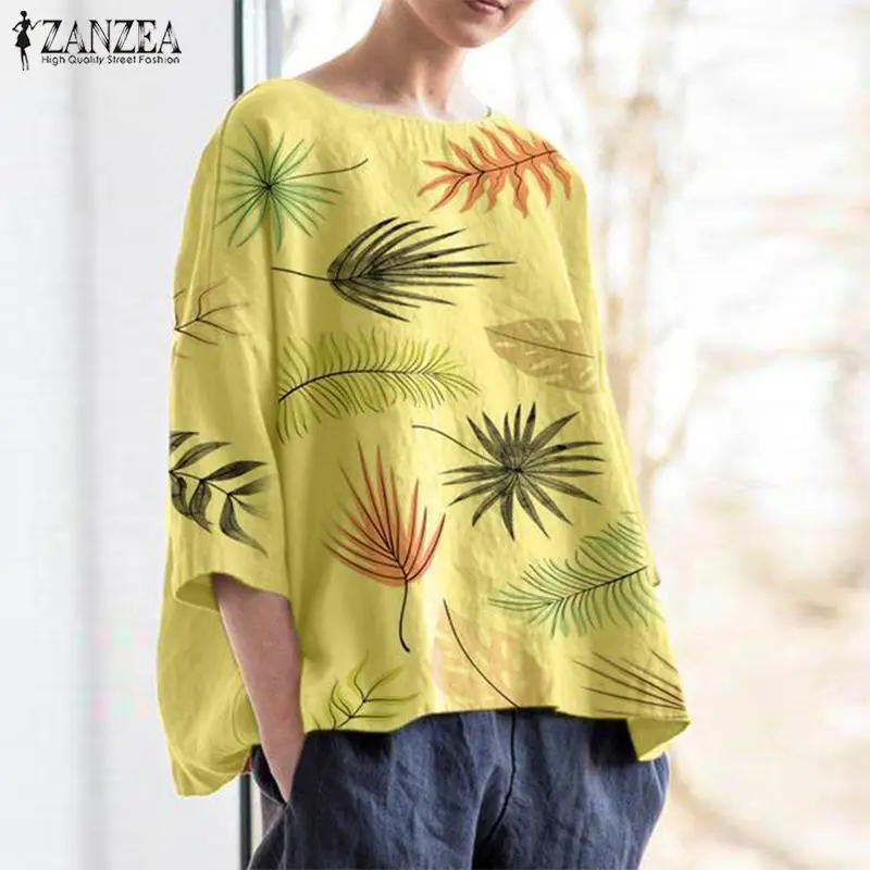 ZANZEA 2020, винтажные рубашки с цветочным принтом, женская блузка, Повседневная блуза с круглым вырезом, женские блузы с рукавом 3/4, рабочая блуза размера плюс, сорочка